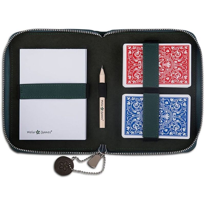 The handmade zip case has been crafted in sustainably-certified genuine full-grain leather. The zip case houses 2 decks of playing cards, perfect for rummy, canasta, bridge and more, a notepad and pencil for score keeping.