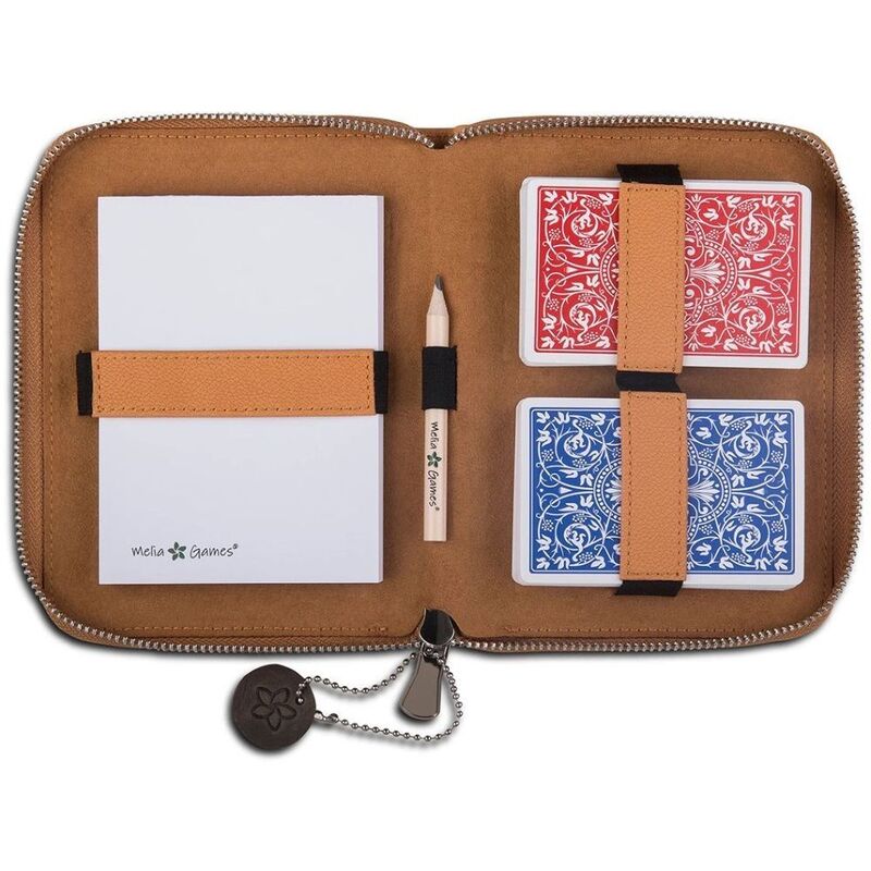 The handmade zip case has been crafted in sustainably-certified genuine full-grain leather. The zip case houses 2 decks of playing cards, perfect for rummy, canasta, bridge and more, a notepad and pencil for score keeping.
