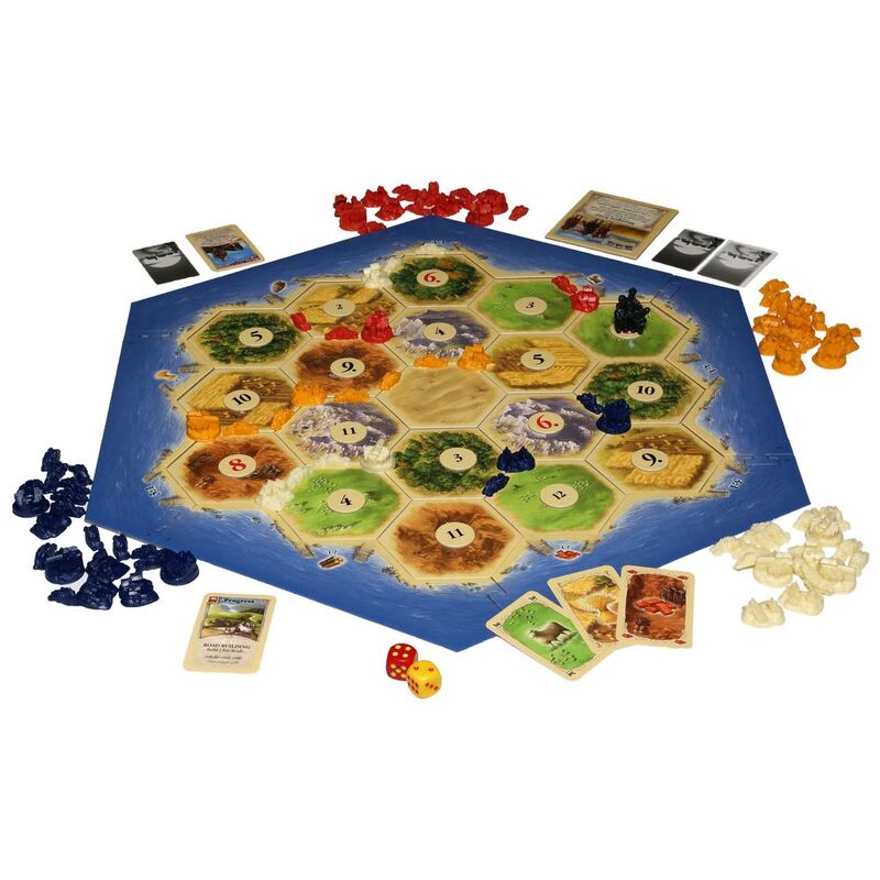 You have been sailing for weeks. You embarked on a quest to settle the isle of Catan! On this famous isle, raw materials and natural resources abound but competition is fierce. You are not the only settler who discovered this isle. Do you have what it takes to become the sovereign of Catan? Reveal Catan’s many resources: coasts, plains, forests, hills, mountains and deserts. Invest resources, negotiate and expand strategically. But beware! Space will become increasingly scarce and clever trade will be a necessity. Become the best trader and guide your settlers to victory and prosperity! Catan’s random mix creates a different board every game. It has thrilled millions of players around the world and now it is yours to enjoy!