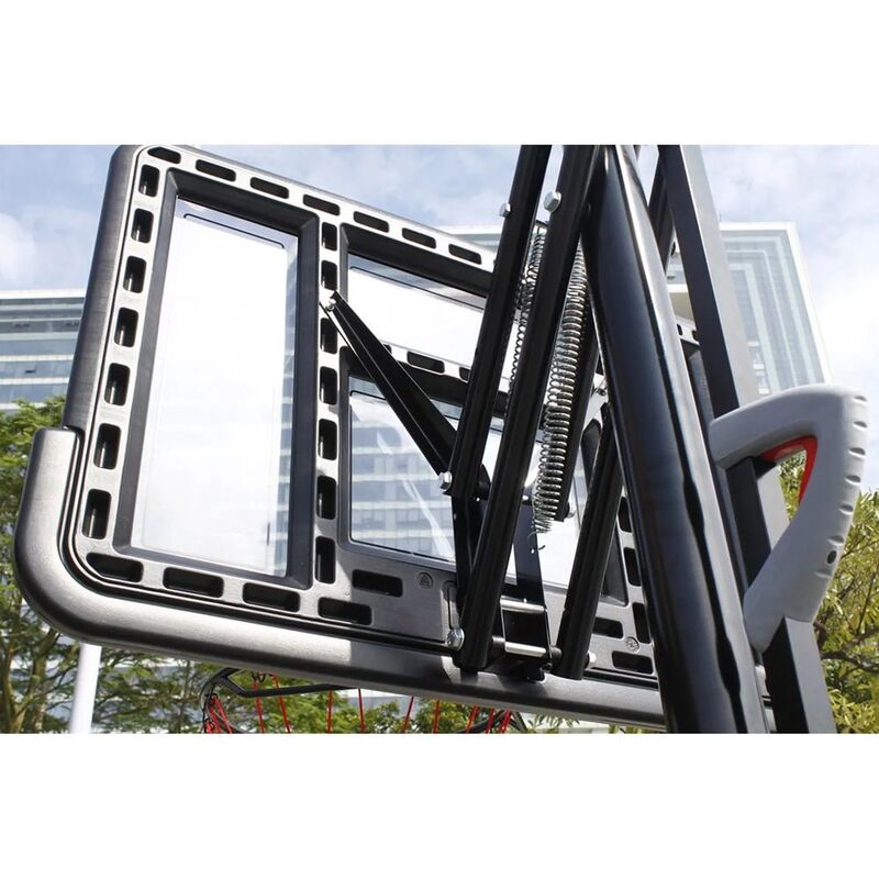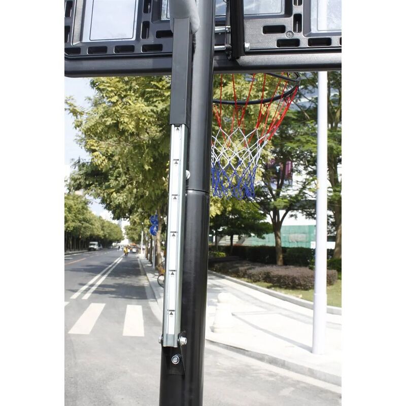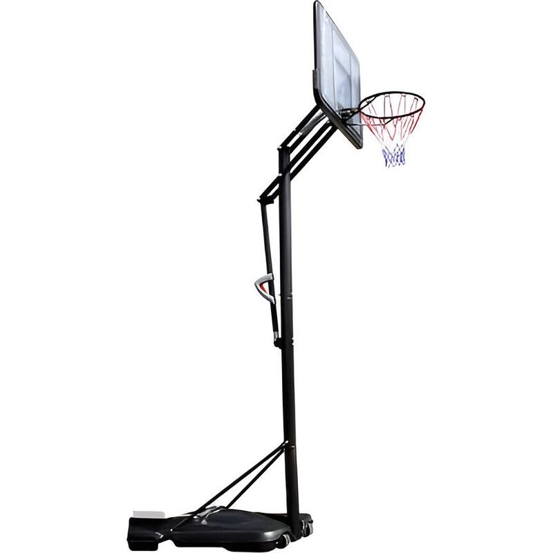 Experience superior basketball performance with the Knight Shot Outdoor Basketball Post. This adjustable post allows heights from 2.30m to 3.05m (7.5 to 10 feet) with a convenient power lift adjustment system. The 45cm (18-inch) diameter steel rim, weatherproof nylon net, and 120 x 80cm (48 x 32-inch) backboard with the KS logo ensure durability and a professional look. The three-piece round steel tube construction (86mm diameter) and a blow-molded PE base (120 x 78 x 23cm, fillable with 125kgs of water) provide stability for an unmatched playing experience.