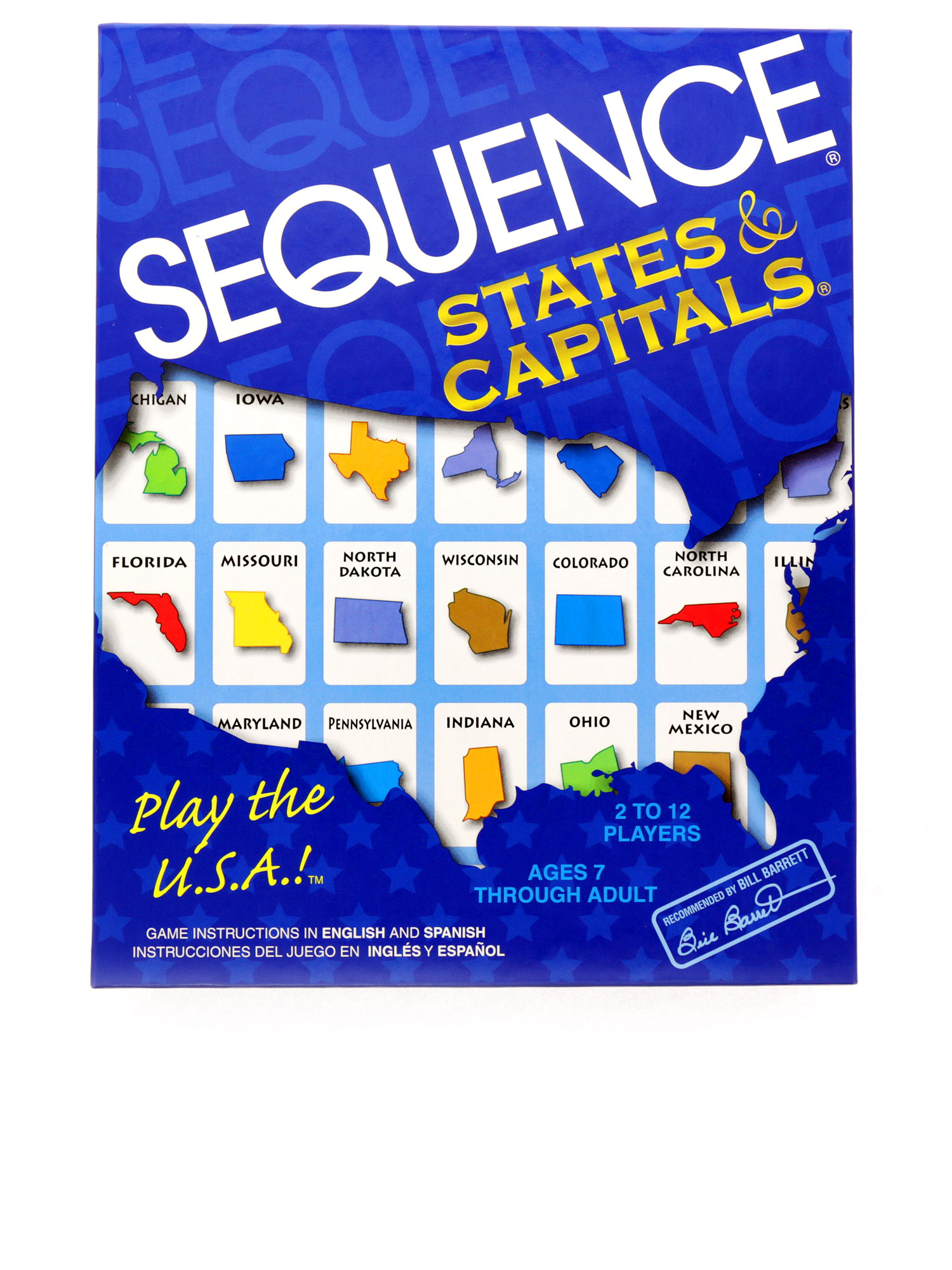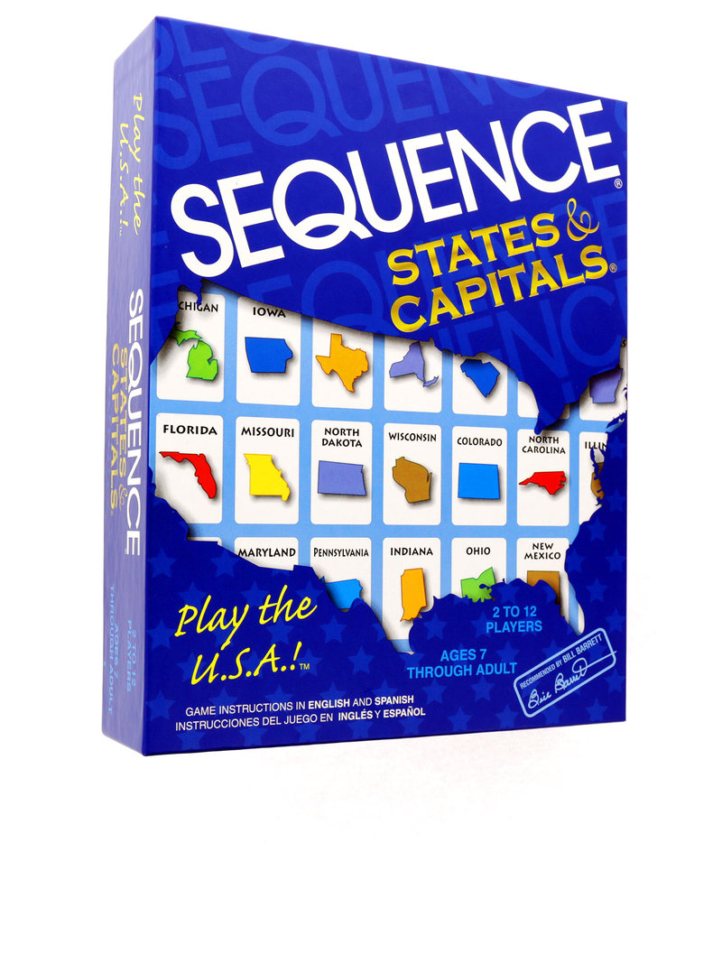Each card has the name of a capital with its location shown on the state. Players match the state's shape and color on the card to the same state and shape and color on the board, then place a chip on that space. When you have five in a row it's a SEQUENCE. Players of all ages will have fun learning the states and their capitals while enjoying the fun, challenging play of the SEQUENCE game.