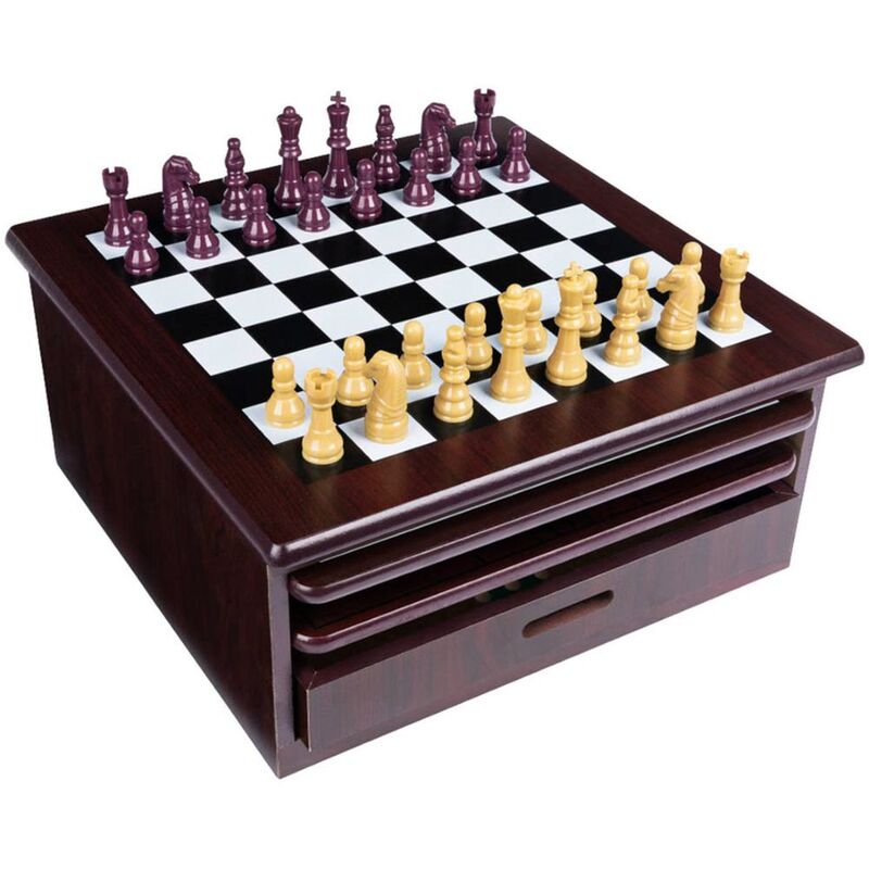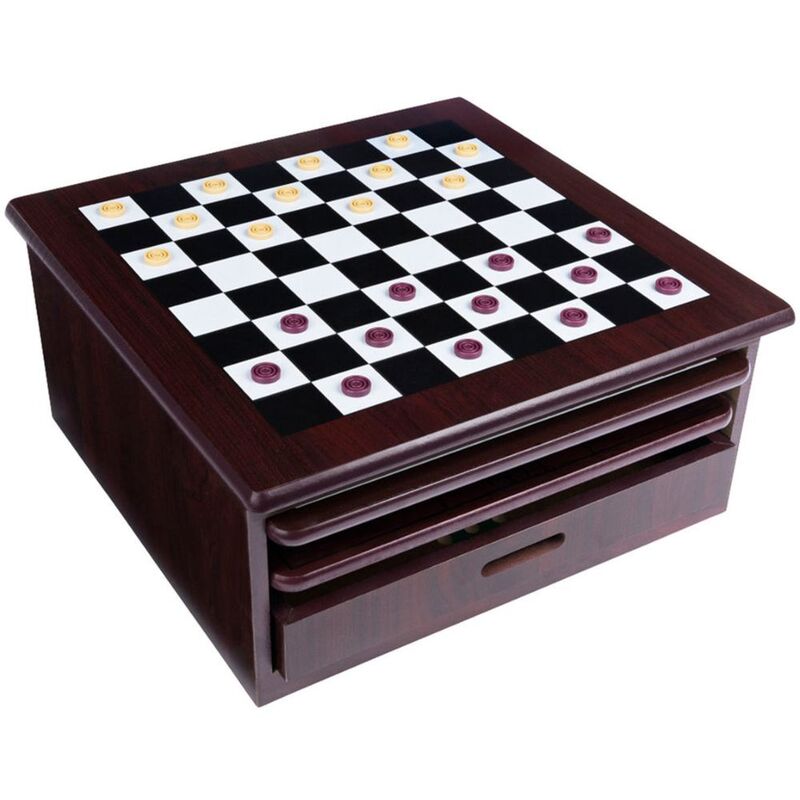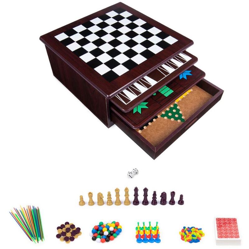 12-In-1 Wood Game Center features all time family favorites in a beautiful wood storage center. Includes Chess, Mancala, Checkers, Backgammon, Pachisi, Tic Tac Toe, Passout Solitaire, Chinese Checkers, Pick Up Sticks, Playing Cards, and Snakes and Ladders.