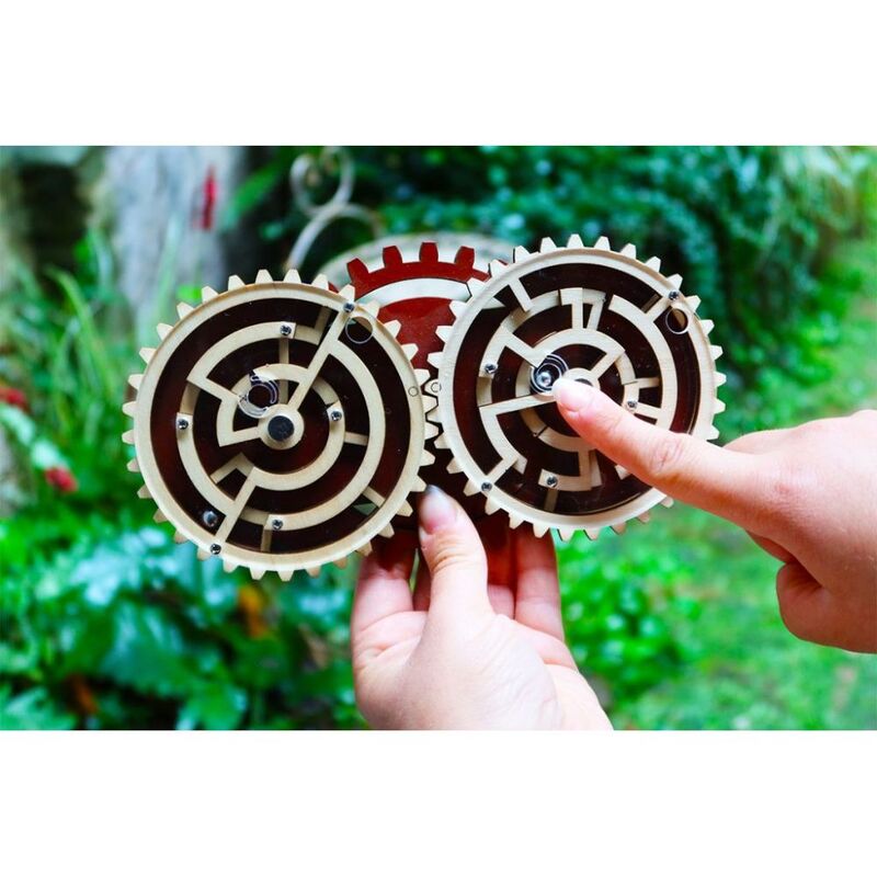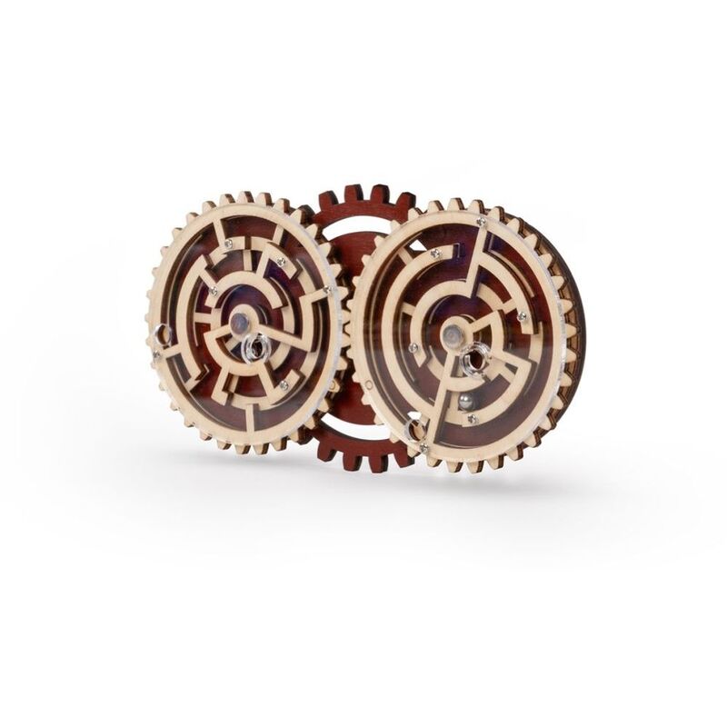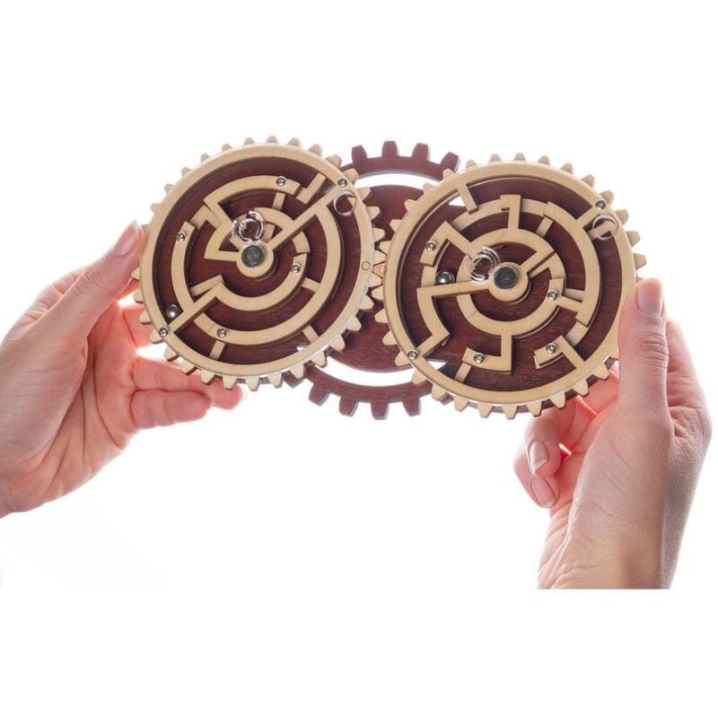 Two mazes, two balls, everything connected by giant gears. On their own, each maze is manageable. Can you find the way to remove both balls from the mazes simultaneously, though? Careful! The gears move at the same time, so a step towards the exit on one side may be a step backwards on the other.