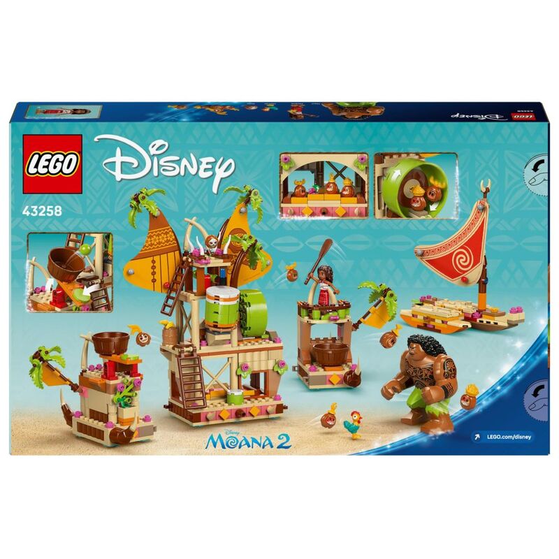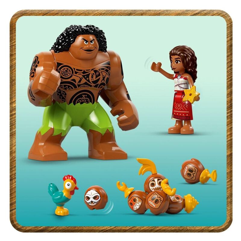 • • Moana boat building set – Includes a barge boat with 3 sections and a zipline, a smaller, 2-hulled canoe with storage space, Heihei the chicken, Moana, Maui, Kotu and 5 more LEGO® ǀ Disney characters