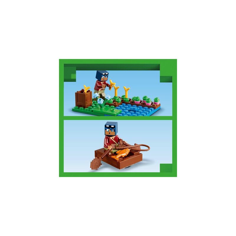 - Minecraft® figures set – This authentic playset includes a buildable house with Minecraft characters: the Swamp Explorer, a zombie, a drowned, a slime and 3 frogs