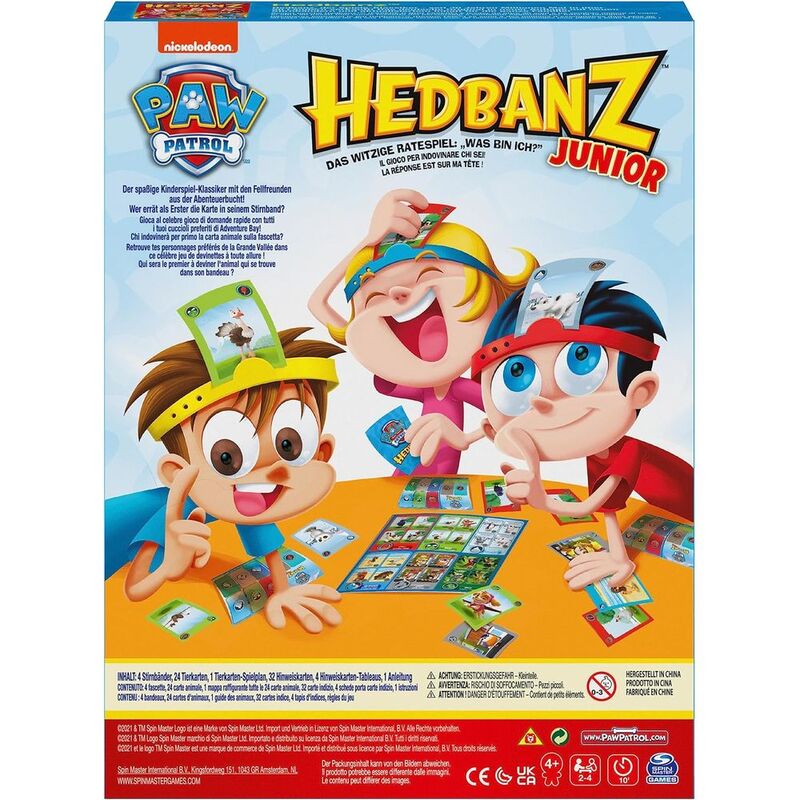 HedBanz Jr. PAW Patrol is the quick question game of "What Animal Am I?" This cool iconic game is now made especially for kids! Pick up your Headband, insert an animal card, and try to figure out which animal is on your head! Ask funny questions like "Do I have wings?" and many more. This hilarious kids game will keep kids excited and entertained!Includes: 4 Headbands, 24 Animal Cards, 1 Animal Card Map, 32 Clue Cards, 4 Clue Card Mats