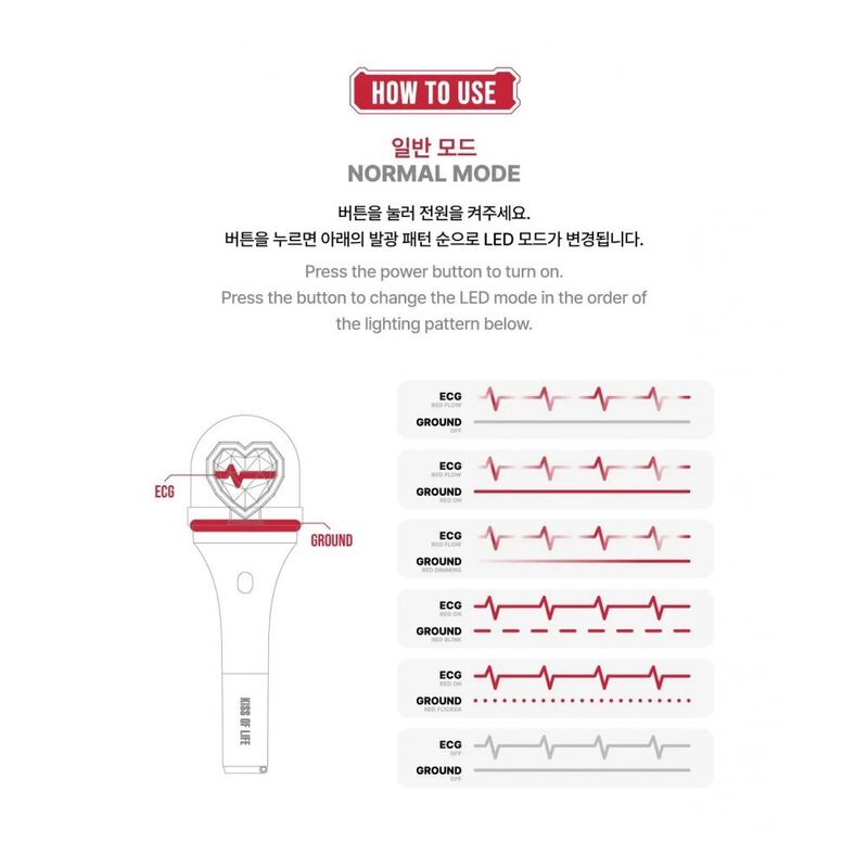 The lightstick consists of a black rod with a transparent dome on top. There is a red heart in the dome with a heart rate line running through it. This is the girl group's logo, which is based on their name. The name "KISS OF LIFE” stands for the mouth-to-mouth resuscitation method. Belle, Natty, Julie and Haneul want to breathe new life into the K-Pop scene. In addition to the lightstick, you also get a hand strap, a guarantee and a stylish box.