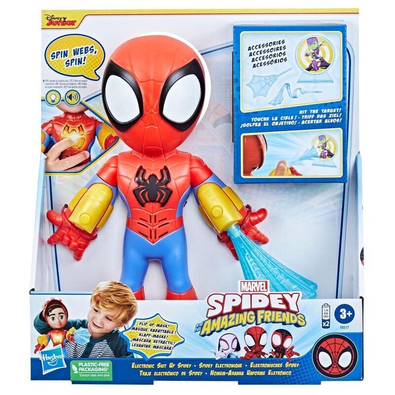 Marvel Spidey and His Amazing Friends Electronic Suit Up Spidey action figure is a super hero toy kids won't want to put down! This large scale 10-inch Spidey toy is easy to hold during playtime, to stand up for display, or as a Marvel hero buddy to watch Disney Junior's Spidey and His Amazing Friends with! Electronic Suit Up Spidey features a mask kids can flip up and down to reveal Peter Parker's face, sounds and phrases from the show, and an icon on Spidey's chest that lights up. This Spidey and Friends toy also includes 2 web projectile accessories kids can blast from one of Spidey's wrists for even more imaginative interaction during playtime. Spidey's other wrist also has an attached web accessory with a spinning feature! Imagine defeating baddies by setting up the included standing Green Goblin target for web blasting fun! Marvel's Spidey and His Amazing Friends toys make great gifts for boys and girls ages 3 and up, and for any occasion. (Each sold separately. Subject to availability.)