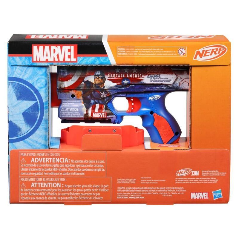 - NERF MARVEL CAPTAIN AMERICA BLASTER: Head into heroic adventures with this eye-catching blaster that features Captain America designs on both sides