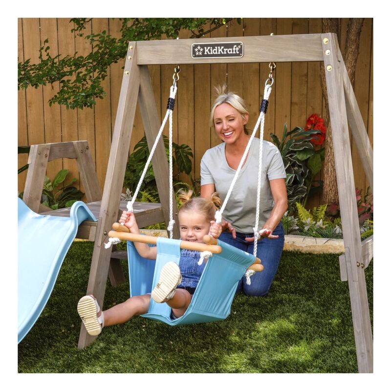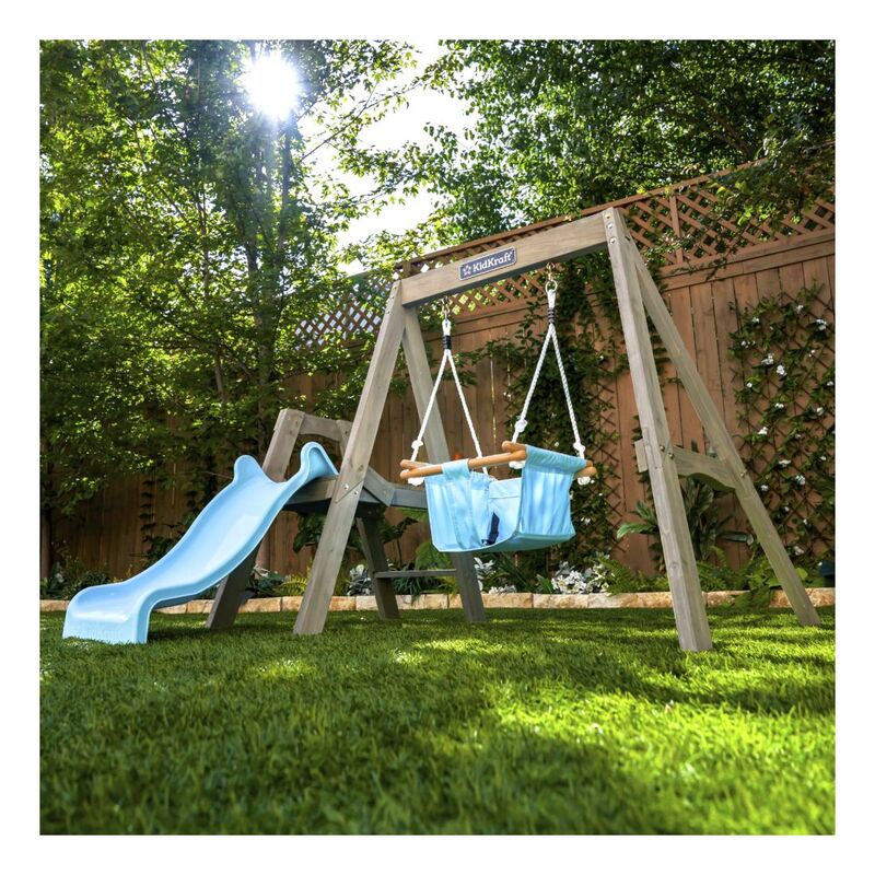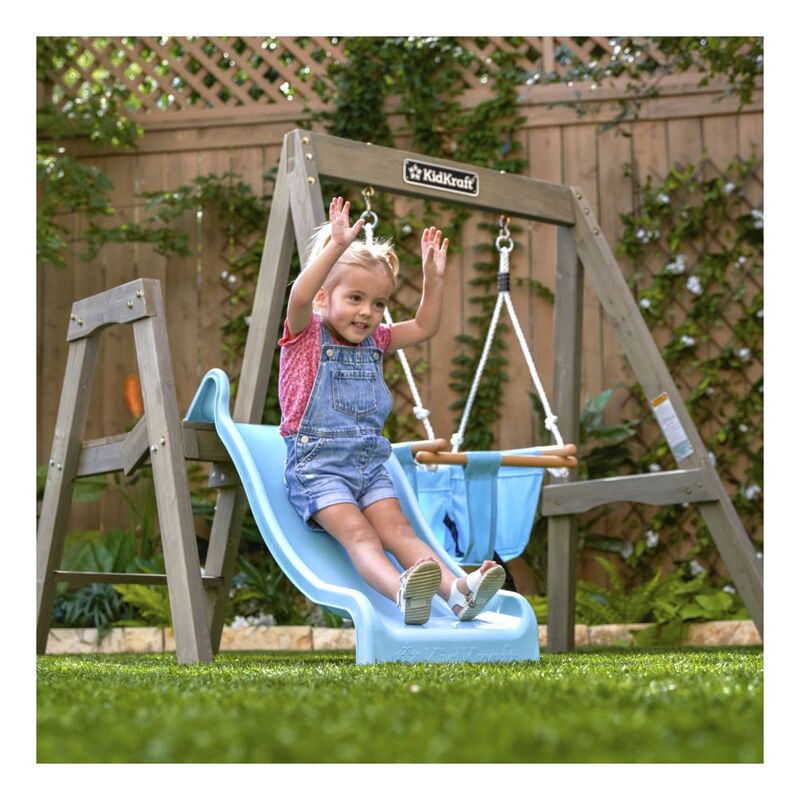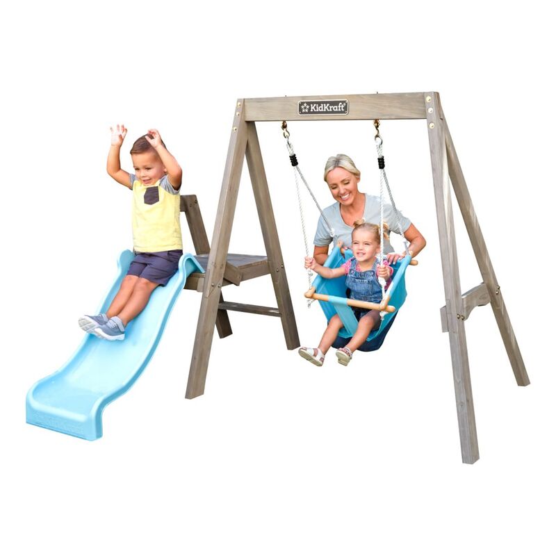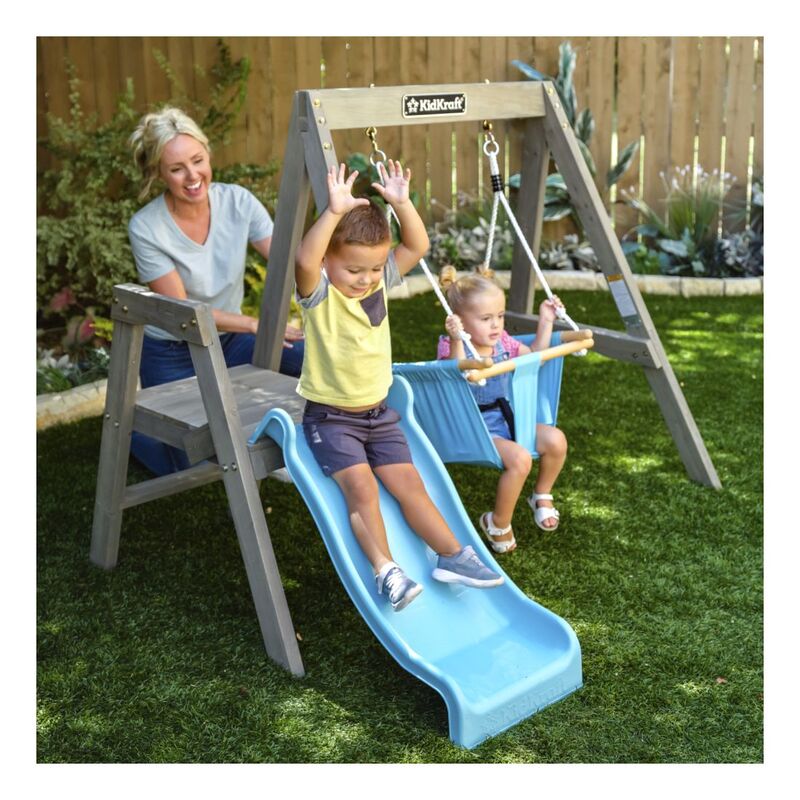 When your child is not quite ready for our big swing sets, this beginner version, the First Play Wooden Swing Set from KidKraft, will help them learn how to swing and slide with ease. Build up their confidence with the one-rung ladder that gets them to the top of the slide. The wave slide has a gently sloped edge for soft landings. Introduce toddlers to the joy of soaring through the air in a bucket swing just their size. The canvas square swing has a safety lap belt for security, and the soft-touch rope is easier on little hands so both parents and kids can thoroughly enjoy the new experience. Add this wooden set to your backyard lineup of active play toys to give kids a well-rounded fun time in the outdoors. With heavy-duty, durable components and water-based, child-friendly stain, this set is ready to withstand the seasons.
