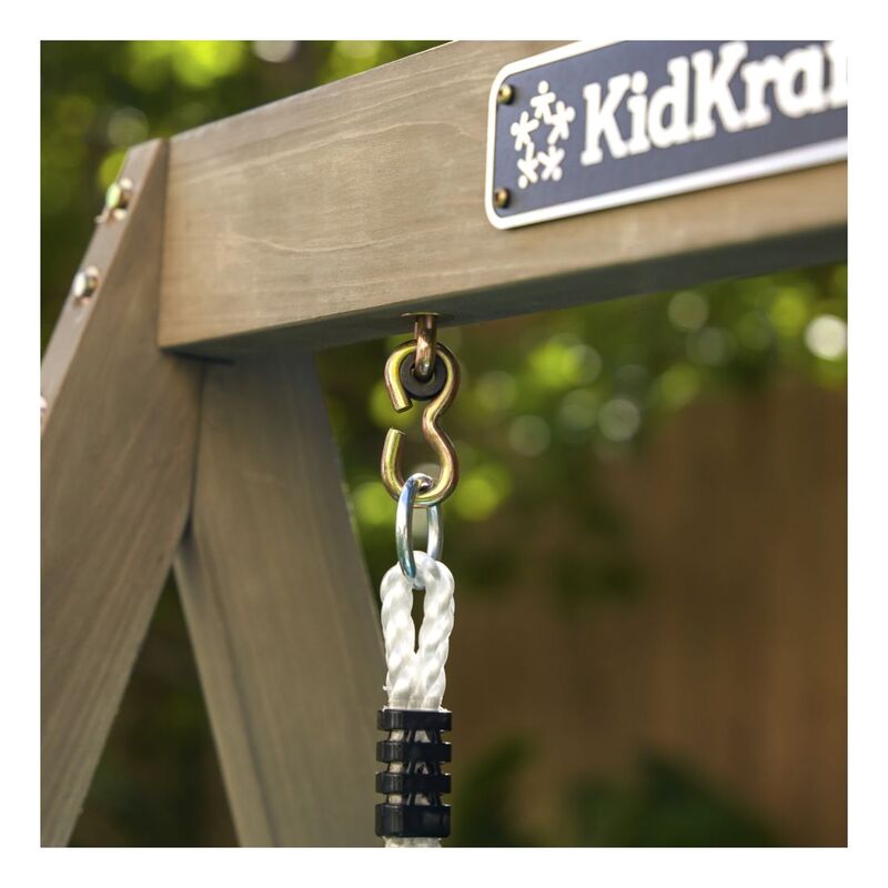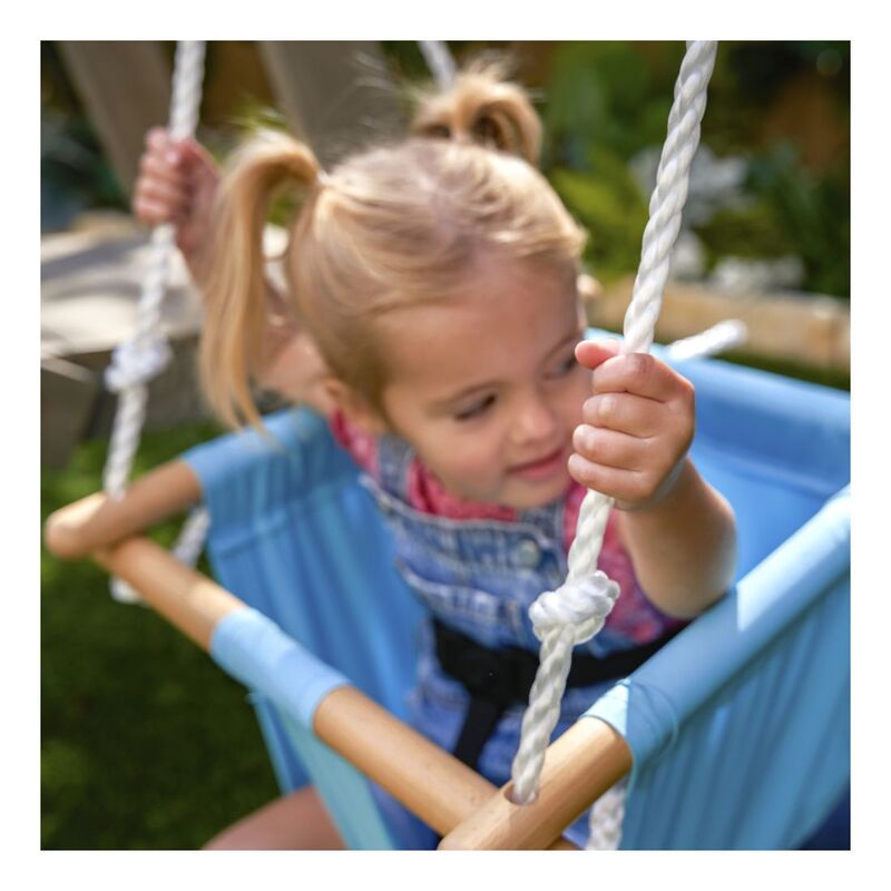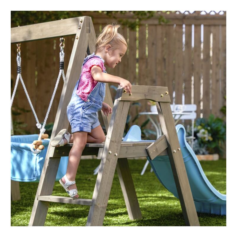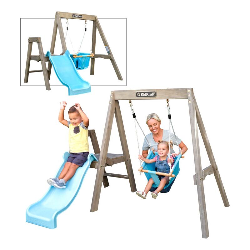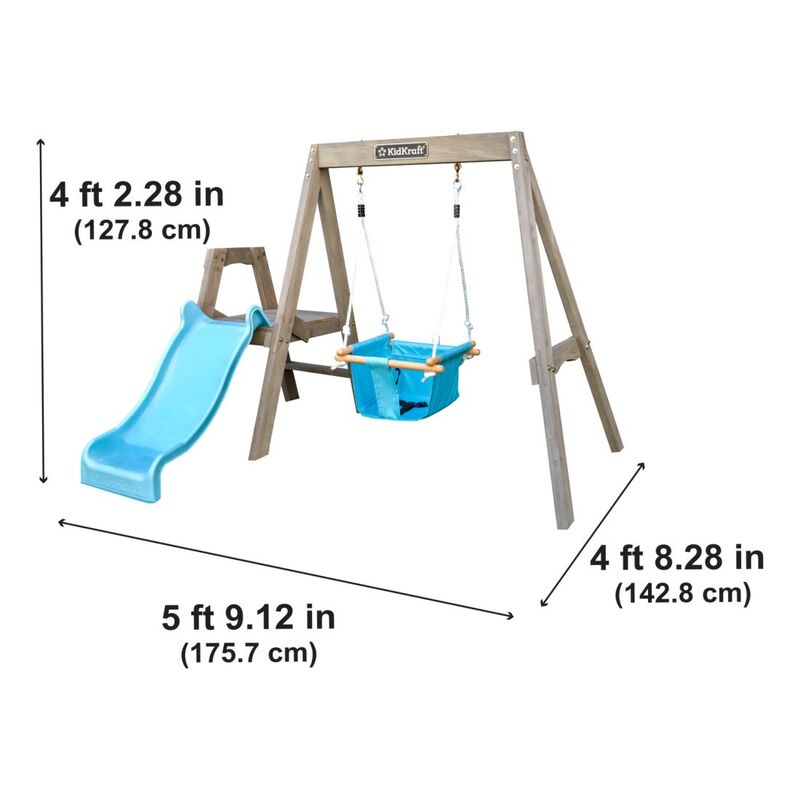 When your child is not quite ready for our big swing sets, this beginner version, the First Play Wooden Swing Set from KidKraft, will help them learn how to swing and slide with ease. Build up their confidence with the one-rung ladder that gets them to the top of the slide. The wave slide has a gently sloped edge for soft landings. Introduce toddlers to the joy of soaring through the air in a bucket swing just their size. The canvas square swing has a safety lap belt for security, and the soft-touch rope is easier on little hands so both parents and kids can thoroughly enjoy the new experience. Add this wooden set to your backyard lineup of active play toys to give kids a well-rounded fun time in the outdoors. With heavy-duty, durable components and water-based, child-friendly stain, this set is ready to withstand the seasons.