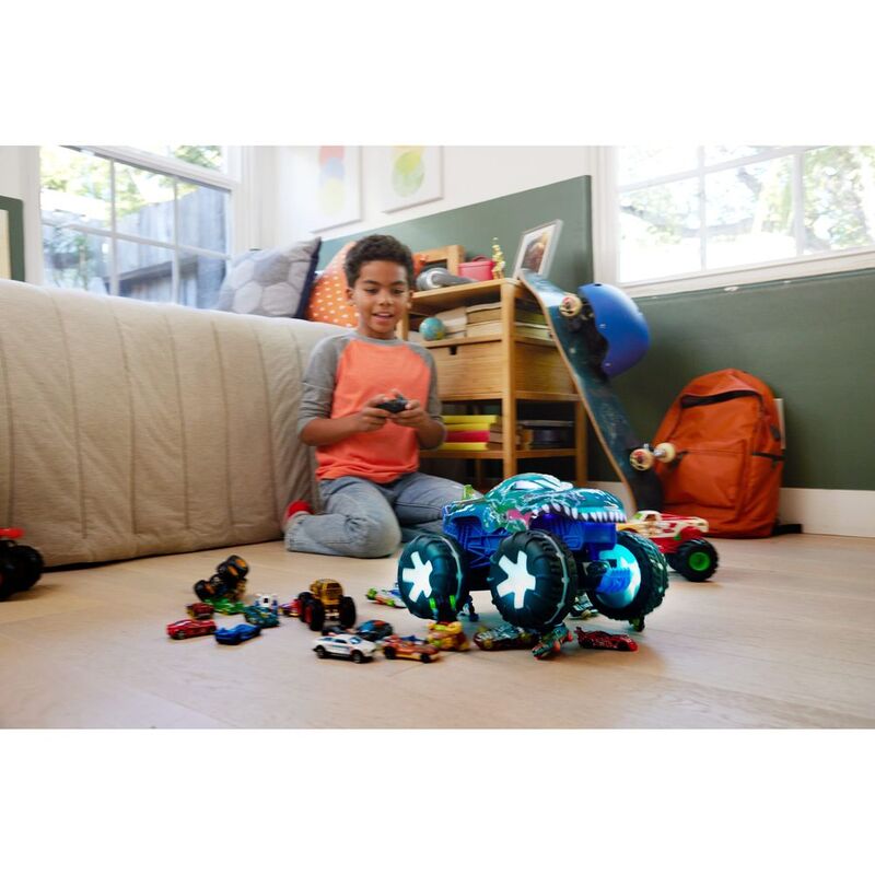 The Hot Wheels Monster Trucks beast Mega-Wrex comes alive in an oversized remote-control vehicle with interactive lights and sounds.