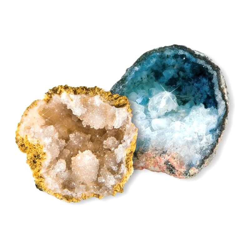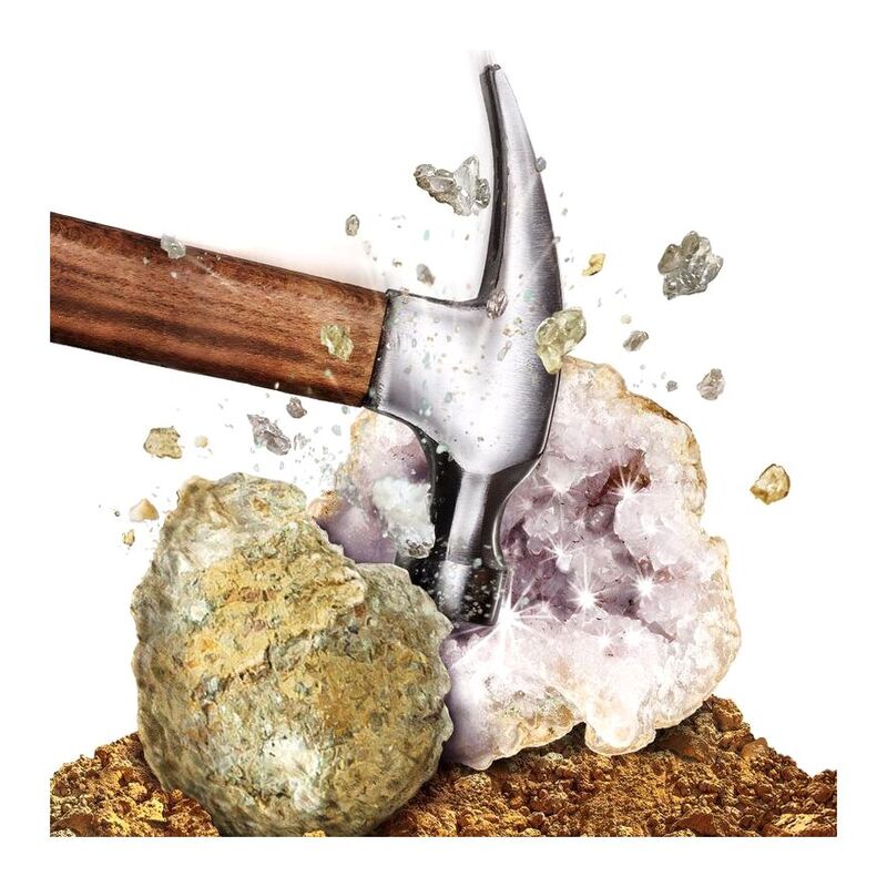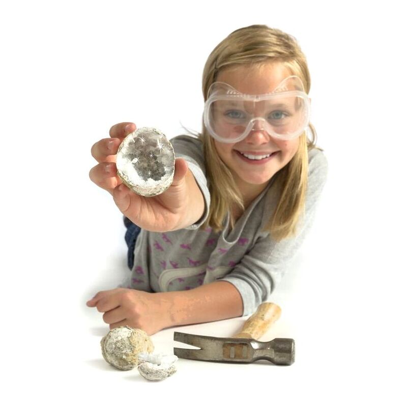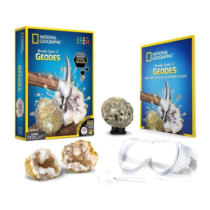 Find incredible crystal treasure hidden with the National Geographic Break Open 2 Geodes kit! Geodes are amazing geological specimens, appearing to be ordinary rocks on the outside. But once you break them open, you'll discover beautiful crystals inside. Every geode is a surprise, and kids love to discover the wonders within each! Safety goggles are included, as well as a full-color geode learning guide. You'll also be able to show off your favorite geode pieces on the display stand and get a closer look at the crystal treasures with the included magnifying glass.