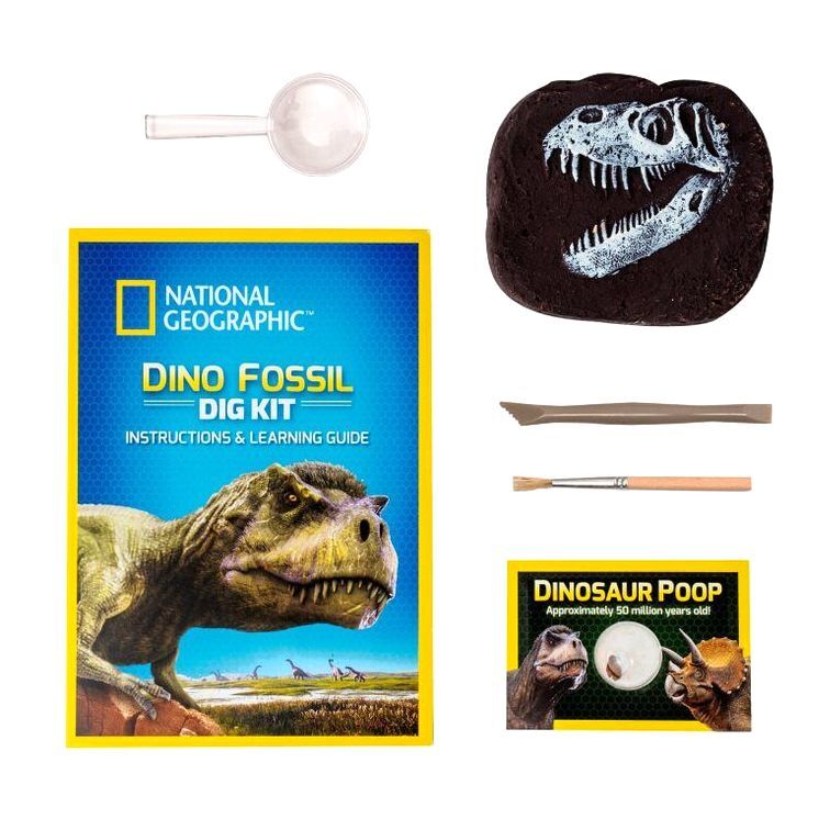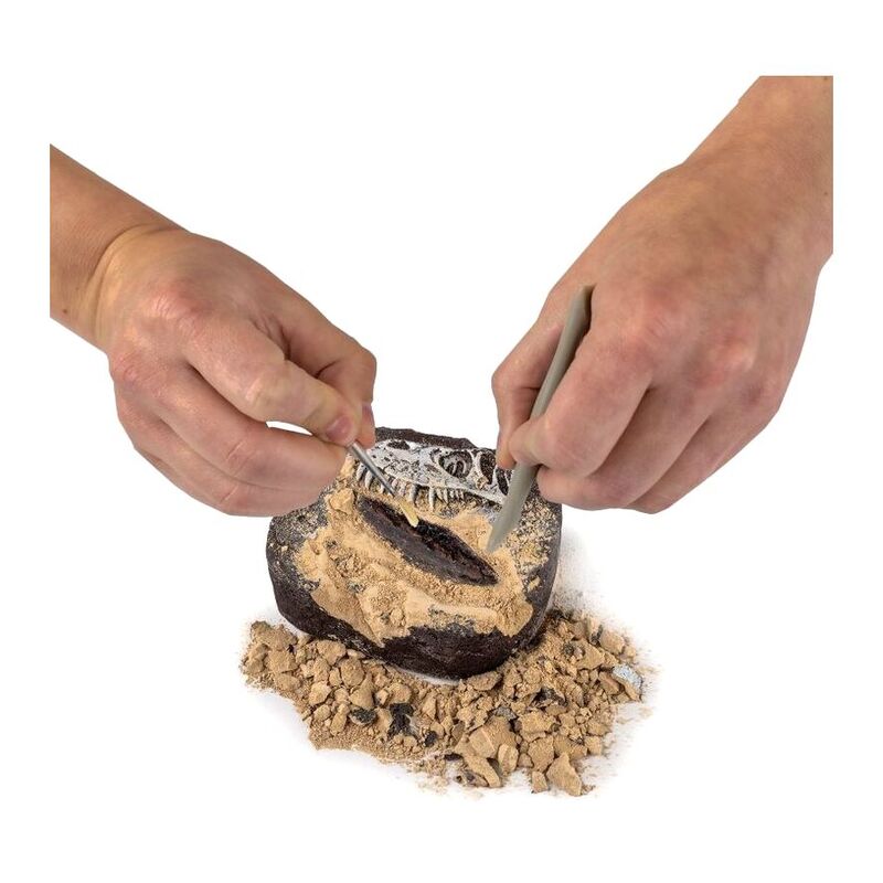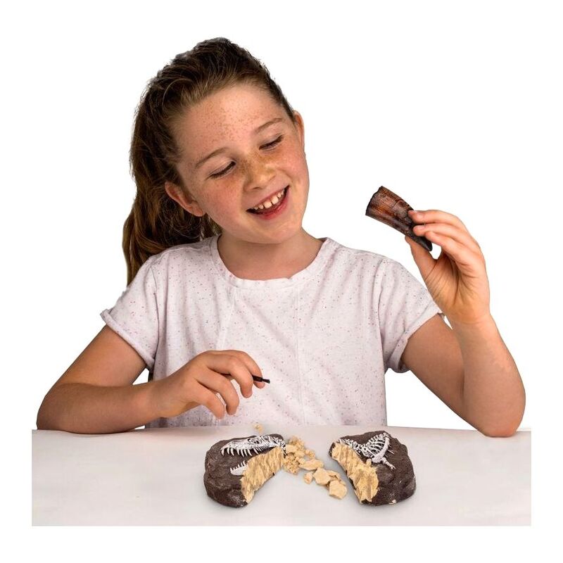 Kids will use the chisel and brush provided in the kit to find a hidden T-rex tooth replica inside the dig. A magnifying glass is also included so kids can get an up-close look at the tooth, and they will learn more about fossils and paleontology in the detailed learning guide.