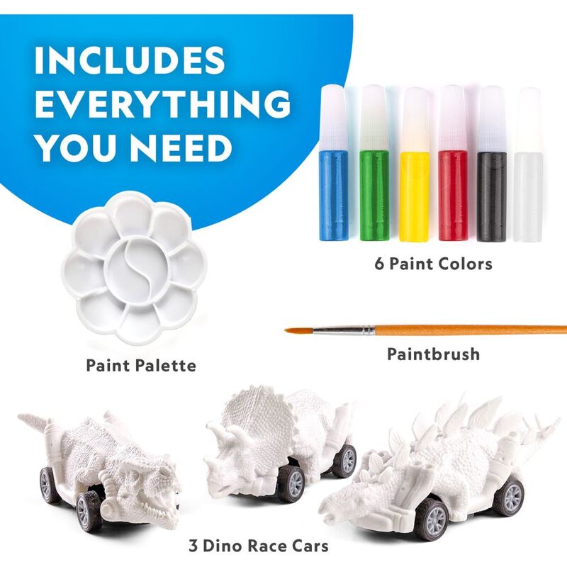 Paint three dino race cars and race them over and over again with the Paint Your Own Dino Race Cars kit!