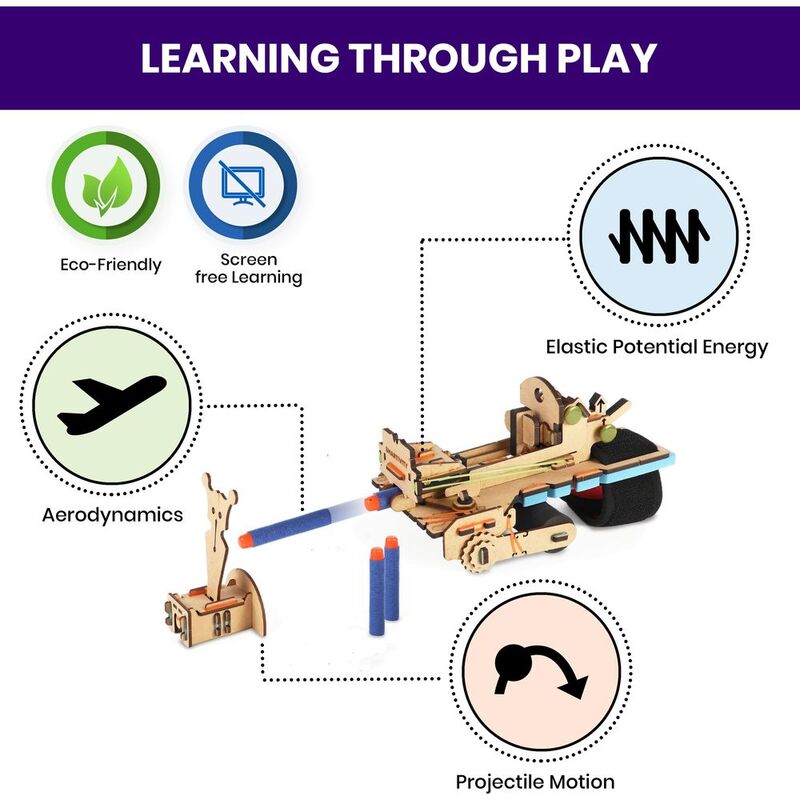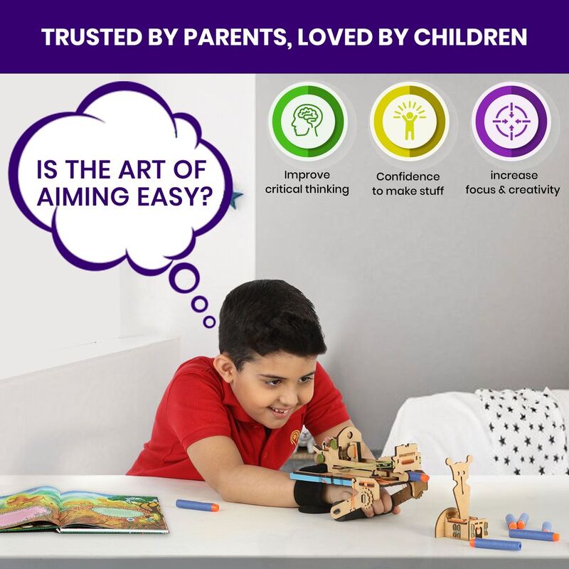The Bulls Eye Bow features a unique design with a pull-to-lock mechanism, allowing kids to easily load and lock their projectiles into place. With a simple press-to-shoot action, they can unleash their creativity and explore the fascinating world of physics. This toy is not only entertaining but also educational, helping children develop their problem-solving skills, hand-eye coordination, and critical thinking abilities. It provides a hands-on experience that encourages curiosity and experimentation.